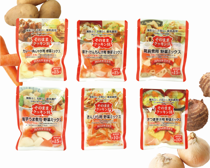 当社は、国産の根菜類の加熱調理済みカット野菜や、「栗」「筍」といった季節農産物の加⼯商品を全国のスーパー・コンビニに販売しています。